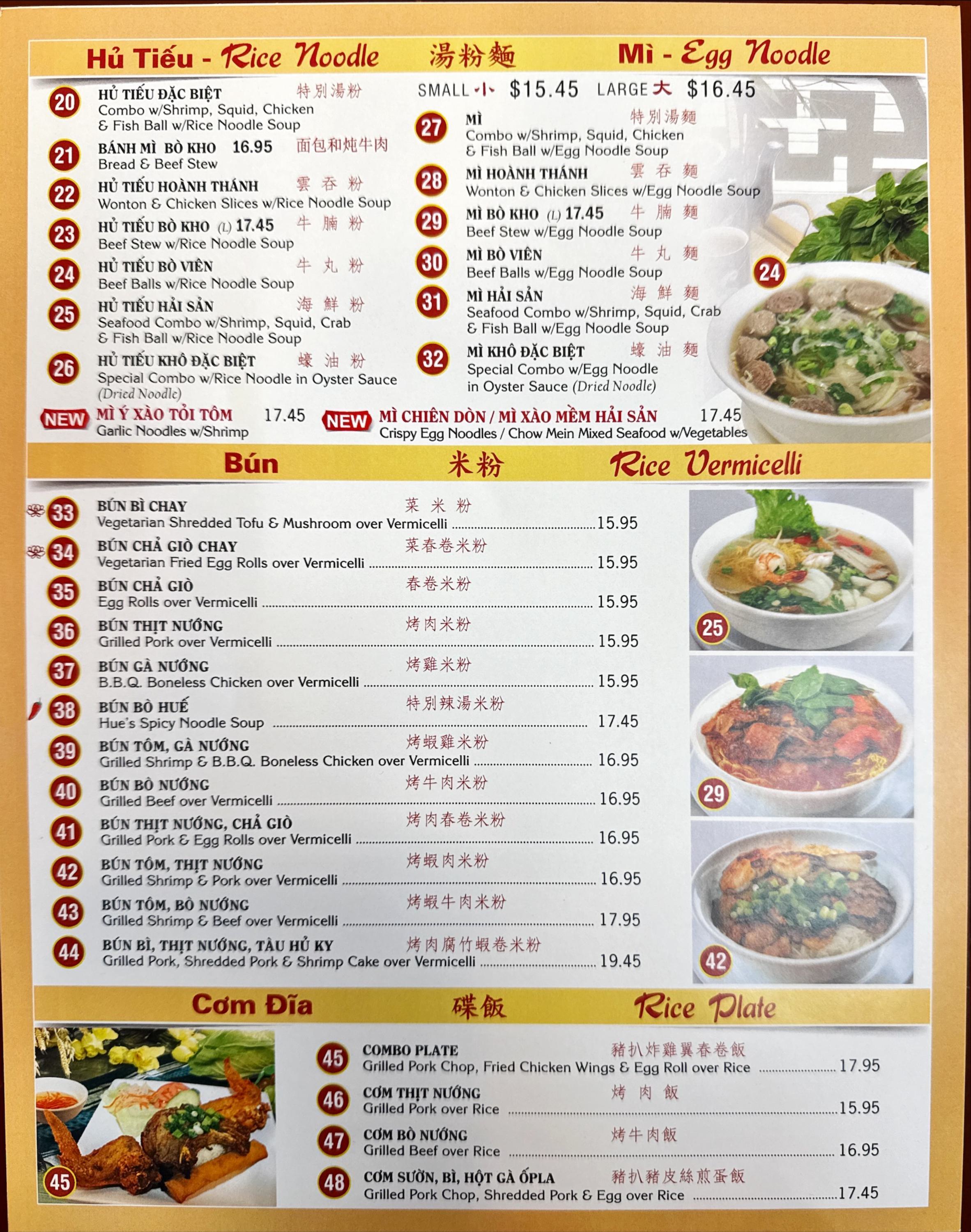 Vietnamese dishes, including Pho, Mì, and Bún Cơm Dĩa, each prepared with fresh ingredients and rich, home-style flavors that transport you straight to Vietnam.